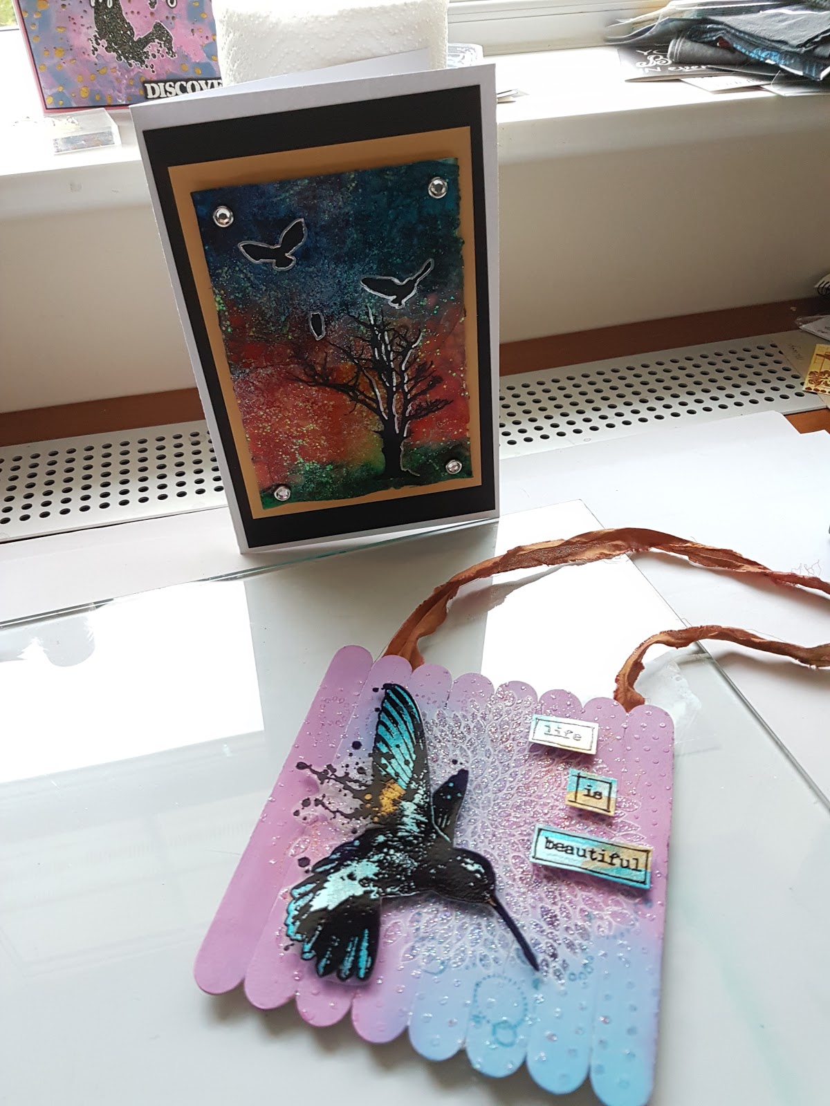 My friend Charli started a venture with Body Shop at Home and hosted a Body Shop evening at her hair salon. She asked me to bring along a selection of cards.. and I quickly knocked up some shaving foam, ink, stencils and paste cards for her. This was a "whilst drying" photo. The tree at the top left sold before I even got to the party (work friend saw it and bought it!).